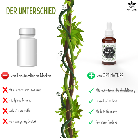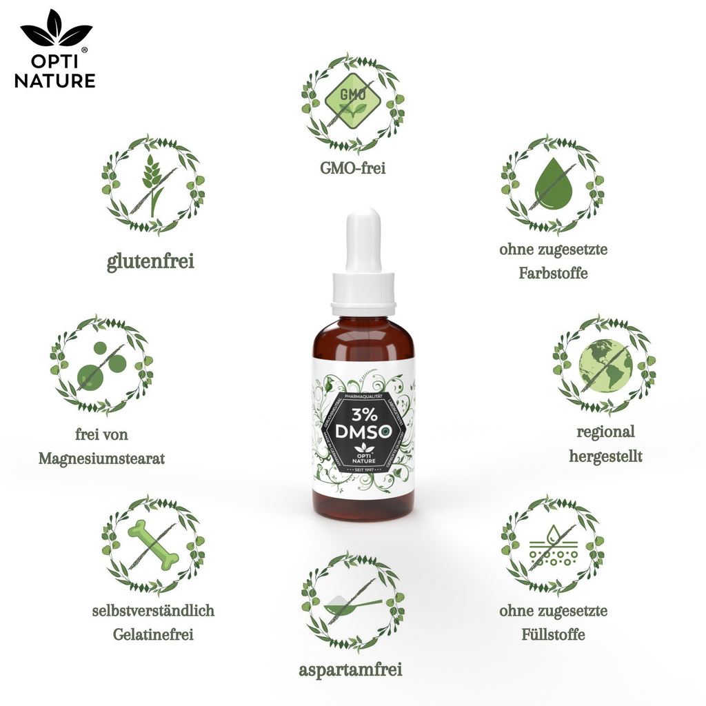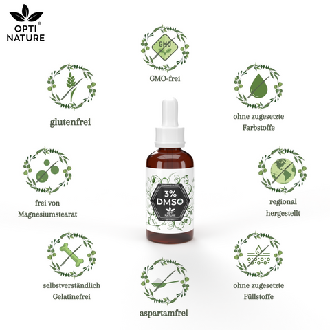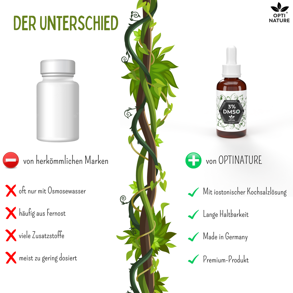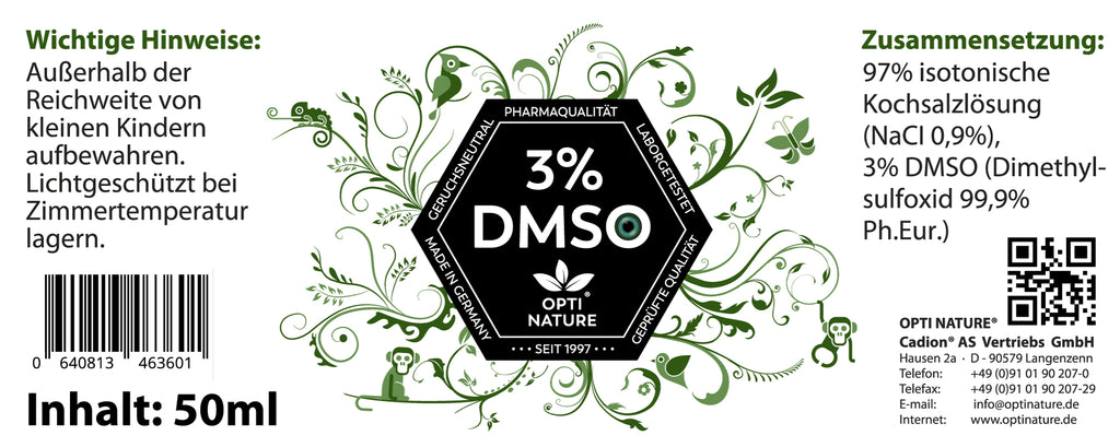 Zutaten: 3% DMSO mit 99,9% Reinheit Ph. Eur., 97% isotonische Kochsalzlösung (NaCI 0,9%) sterilisiert