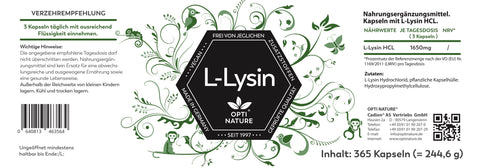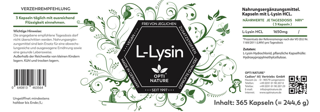 Zutaten: L-Lysin Hydrochlorid, pflanzliche Kapselhülle: Hydroxypropylmethylcellulose.
