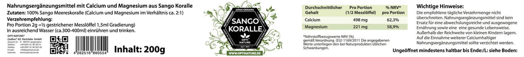 Das Sango Koralle Pulver von Opti Nature ist ein hochwertiges, reines Naturprodukt aus der Sango Meereskoralle (Calcium und Magnesium im natürlichen Verhältnis von ca. 2:1). Dieses ausgewogene Mineralstoffverhältnis unterstützt die normale Funktion von Muskeln, Knochen und Nerven und trägt zu einem gesunden Säure-Basen-Haushalt bei.
