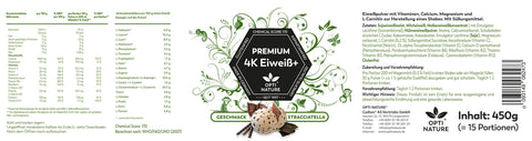 Zutaten: Sojaeiweiß, Milcheiweiß, Molkeneiweißkonzentrat, (mit Emulgator Lecithine(Sonnenblume)), Hühnereiweißpulver, Aroma, Calciumcarbonat, Schokoladenstückchen (Zucker, Kakaobutter, Emulgator Lecithine (Soja)), Magnesiumcarbonat, L-Carnitin (0,2%), Süßungsmittel Sucralose, Ascorbinsäure (Vitamin C), Nicotinamid (Niacin), DL-alpha-Tocopherylacetat (Vitamin E), Calcium-D-pantothenat (Pantothensäure), Pyridoxinhydrochlorid (Vitamin B6), Riboflavin (Vitamin B2), Thiamin (Vitamin B1), Pteroylmonoglutaminsäure (Folsäure), Cyanocobalamin (Vitamin B12).