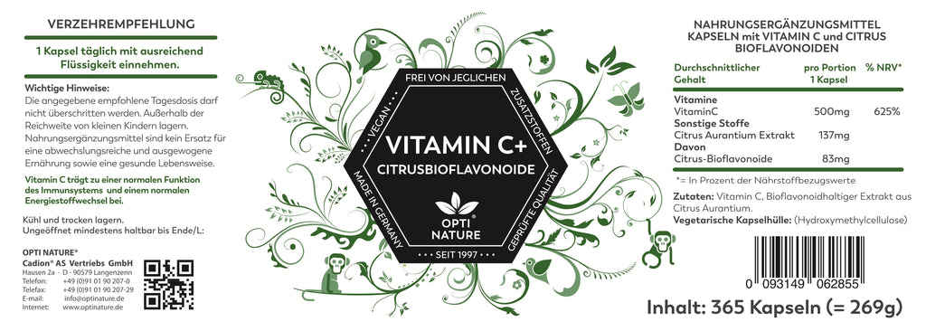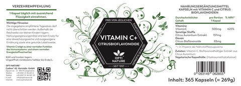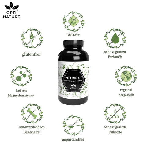 Zutaten: Vitamin C, Bioflavonoidhaltiger Extrakt aus Citrus Aurantium, Hydroxypropylmethylcellulose (Kapselhülle).